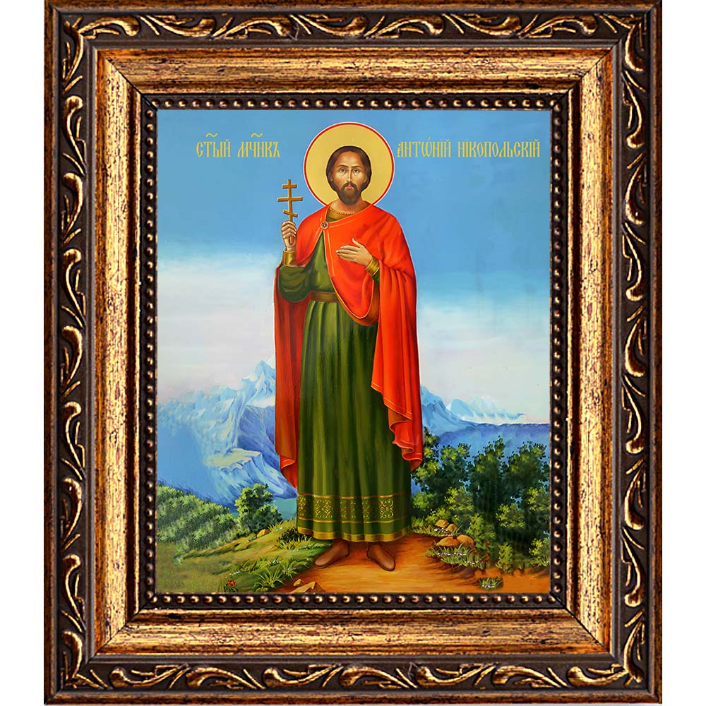 Икона мученика Антония Никопольского (Армянского) - образ одного из сорока пяти святых воинов Христовых, добровольно принявших смерть за веру в армянском городе Никополе в начале IV века. Вместе с другими исповедниками, среди которых были святые Леонтий, Маврикий, Даниил и Александр, Антоний предстал перед гонителем, мужественно отказался отречься от Христа и принести жертву идолам, выдержал жестокие пытки и был сожжен.