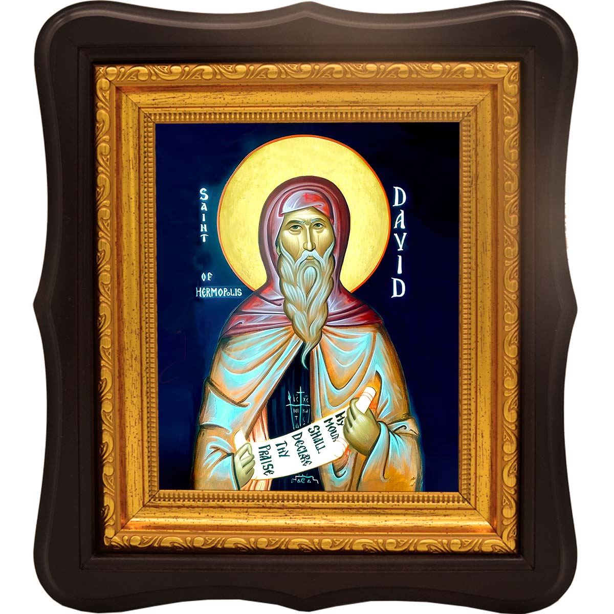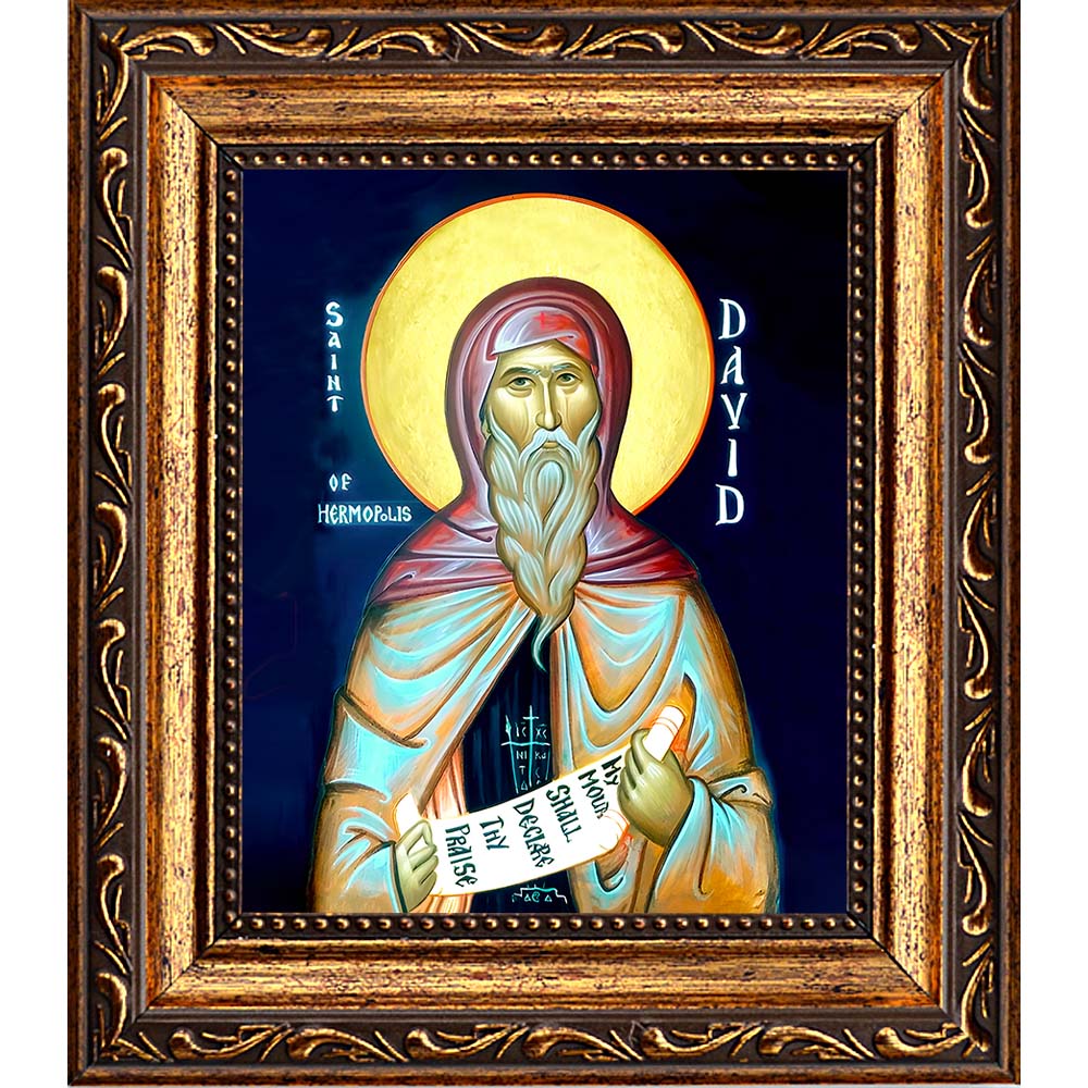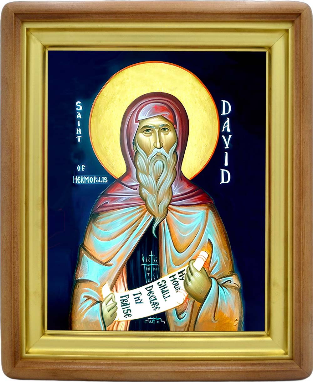 Святой преподобный Давид Ермопольский (VI век) ‒ бывший предводитель разбойников в Египте. В старости, ужаснувшись своим грехам, он пришёл в монастырь и под угрозой возврата к разбою добился принятия в братию. Став образцовым монахом, превзошел всех в подвижничестве. По смирению не поверил в прощение грехов, явленное через Архангела Гавриила, и за маловерие был наказан немотой (кроме молитвы). Обрёл дар чудотворений: исцелял больных и изгонял бесов. Скончался в глубокой старости.