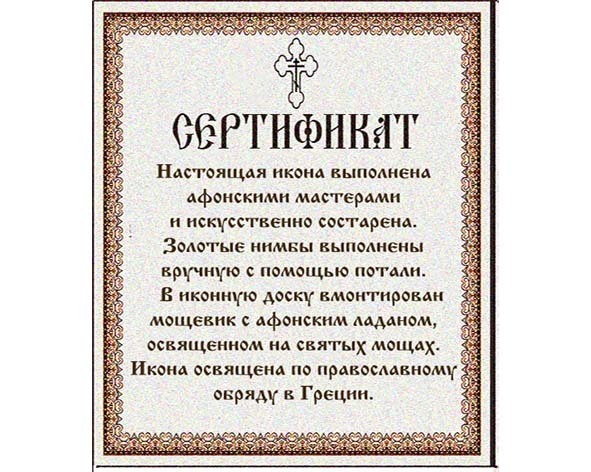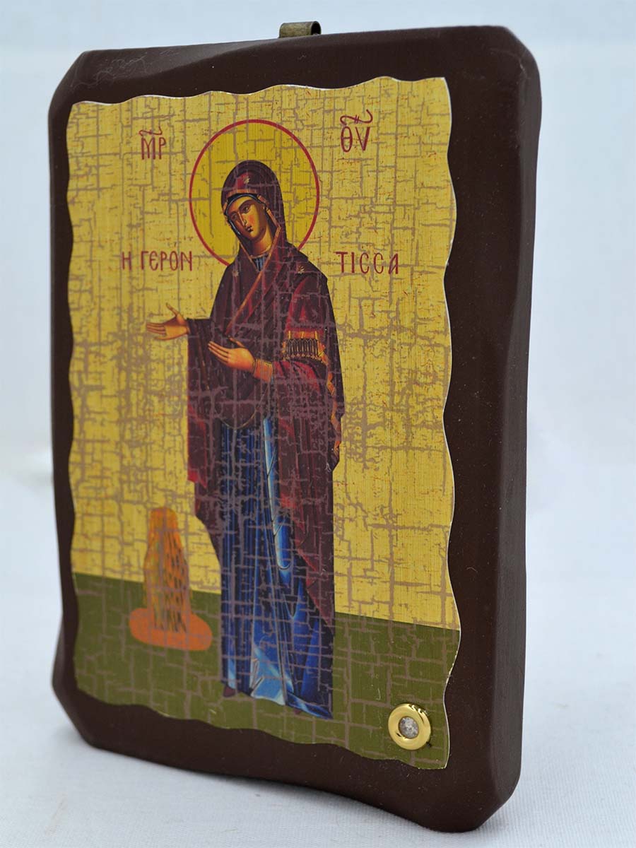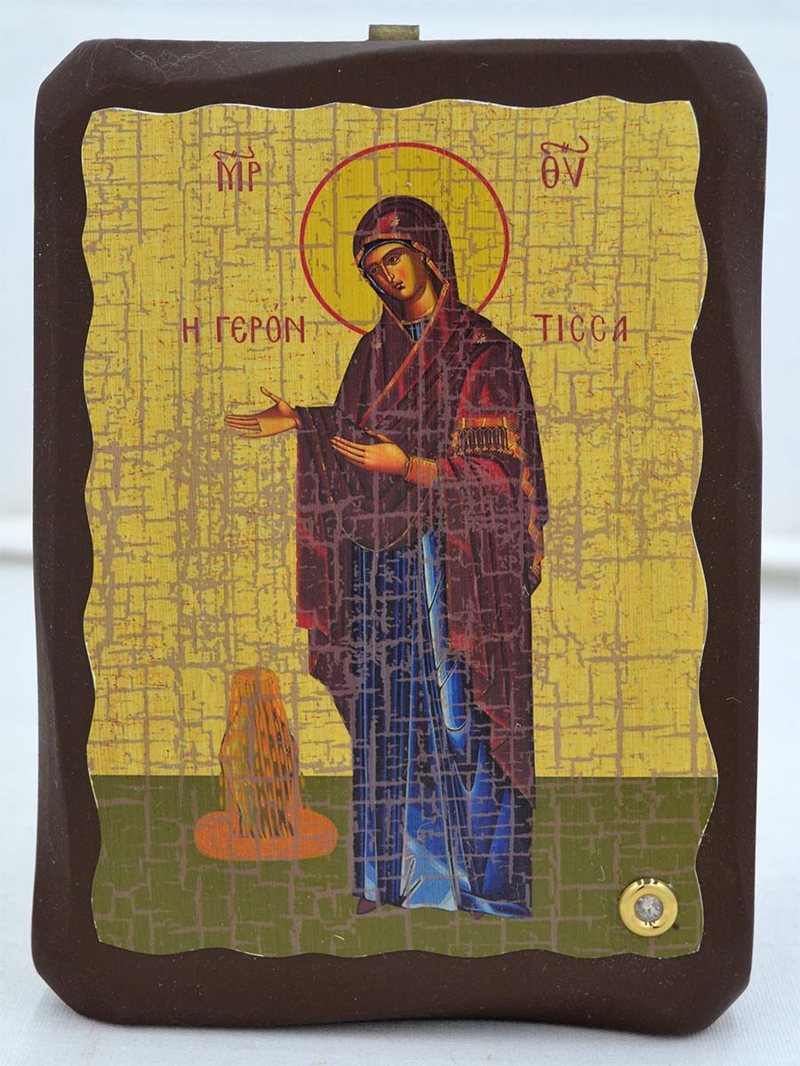 Афонская икона Божьей Матери Геронтисса является заступницей больных, слабых и стариков. В икону встроен мощевик с ладаном, освященном на святых мощах.