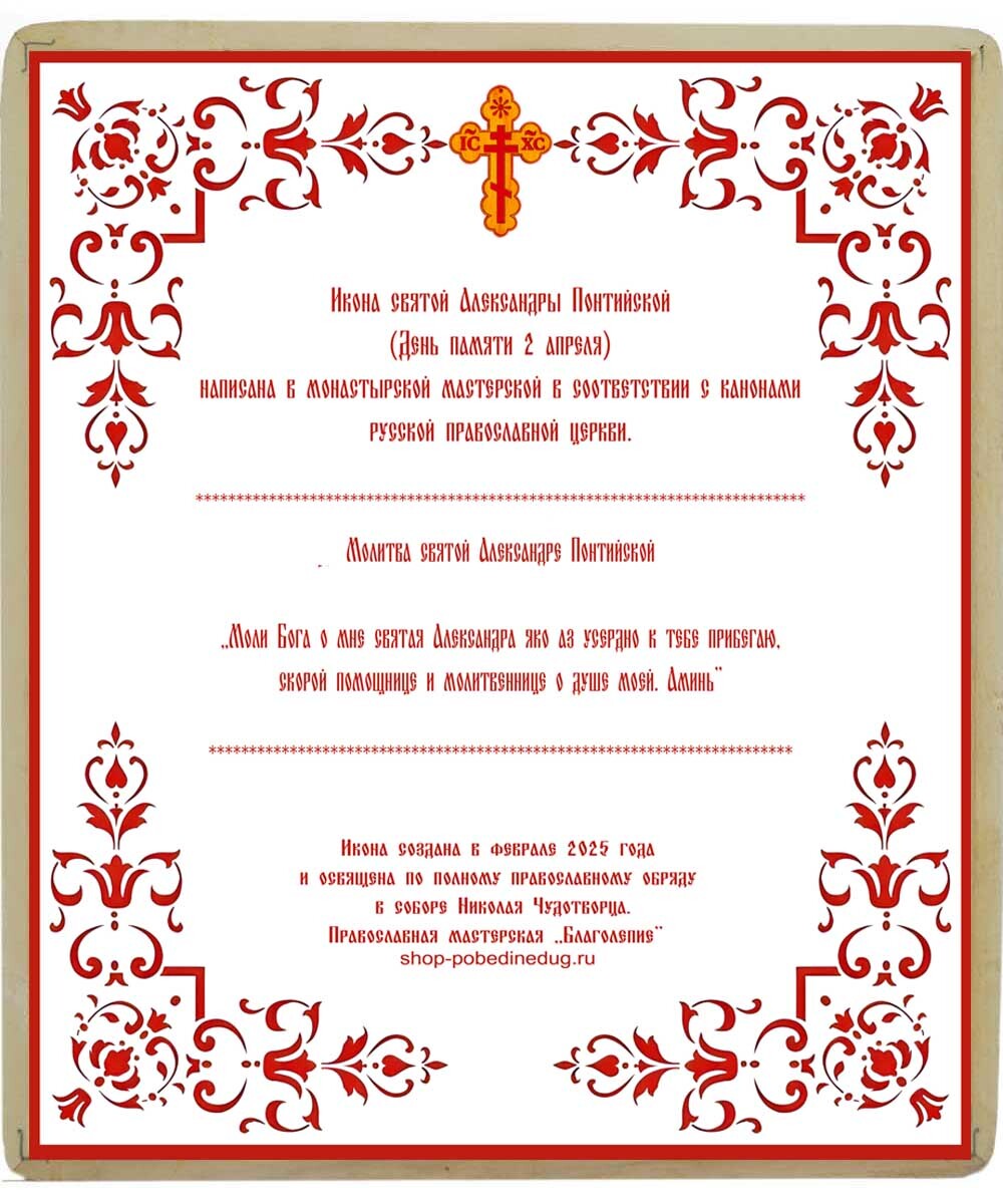 - Небесная покровительница. Святая Александра Понтийская будет молитвенно сопровождать тезку в учебе, выборе жизненного пути, семье и повседневных делах. - Память о призвании. Икона мягко напоминает о христианских добродетелях святой — стойкости в вере, мужестве, милосердии — и вдохновляет подражать им.
