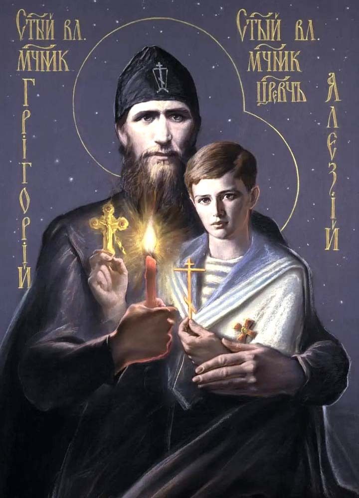 Икона изображает старца Григория и больного гемофилией царевича Алексея. Исторически известно, что Распутин благодаря своему дару или силе внушения несколько раз помогал Алексею в моменты обострения болезни, когда официальные врачи были бессильны. Для царской семьи он был не скандальным старцем, а человеком, который мог облегчить страдания их единственного сына. Поэтому в таком образе заложено несколько смыслов: