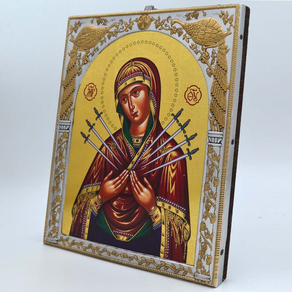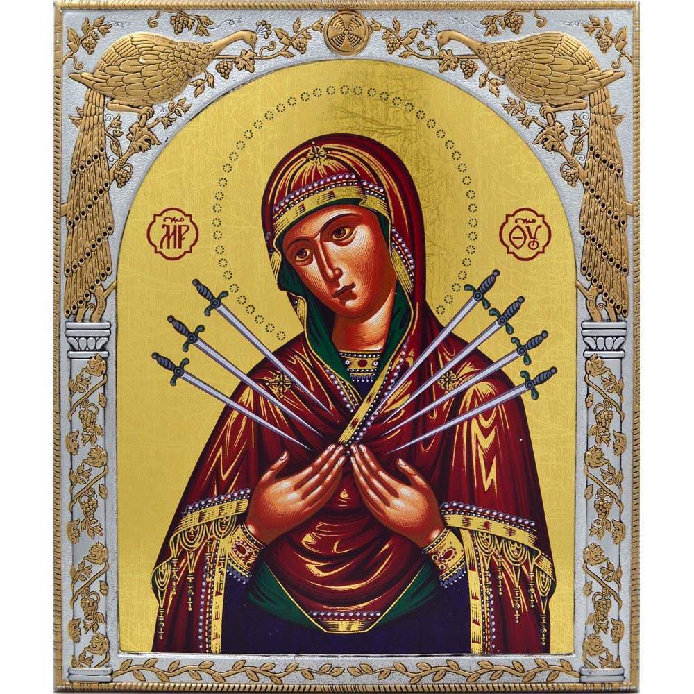 Серебряная икона «Семистрельная Богоматери» — уникальная ручная работа бренда Silver Axion из серебра 925 пробы. Написанная в Греции и освященная по православному обряду, эта святыня станет мощным оберегом вашей семьи, поможет остановить конфликты, примирить близких и защитит вас от недоброжелателей. Стильная деталь интерьера прослужит долго благодаря гарантии 10 лет – прекрасный подарок взрослым и детям!