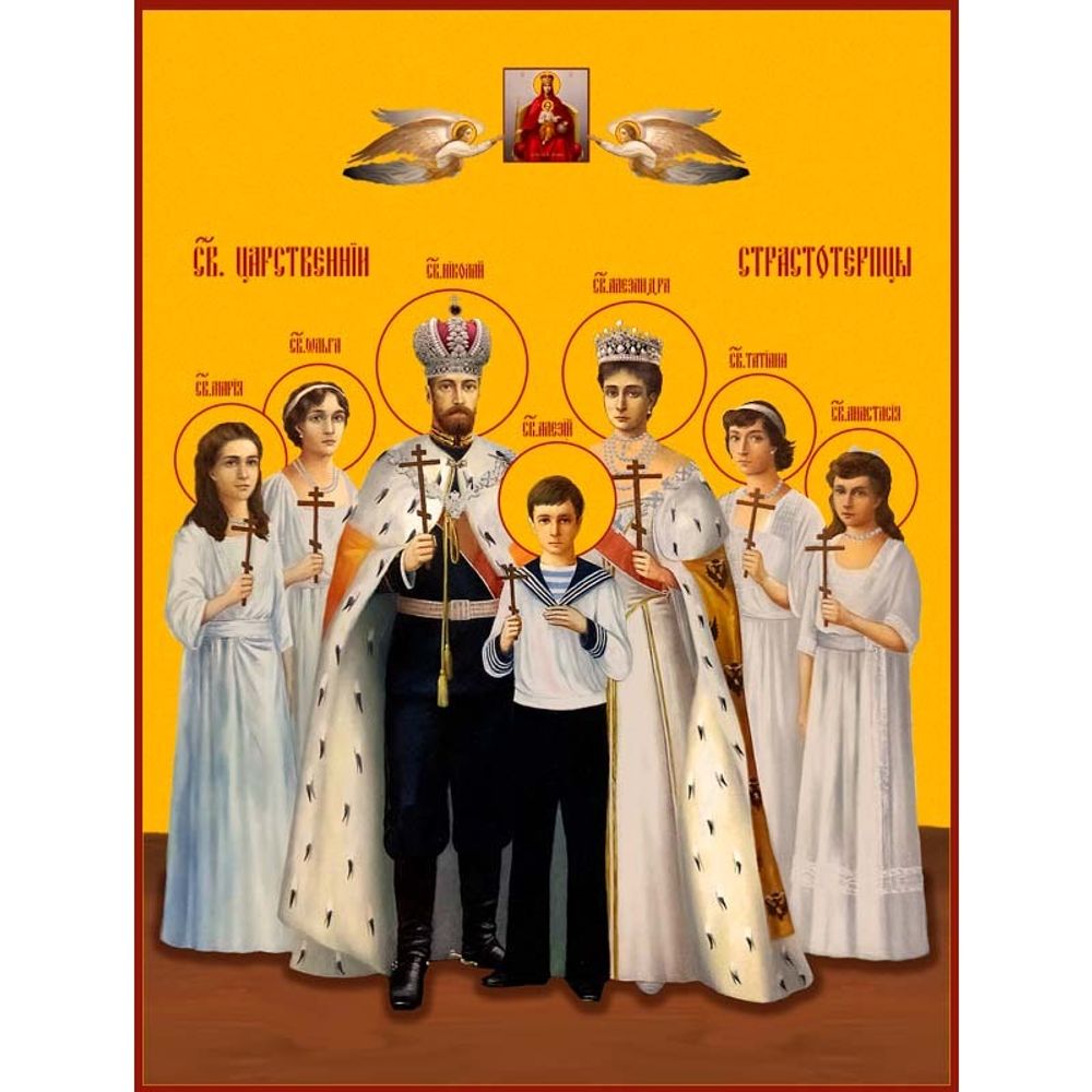 Большую икону Царственных страстотерпцев для церкви можно заказать как рукописную, так и напечатанную на доске, в киоте или без киота.