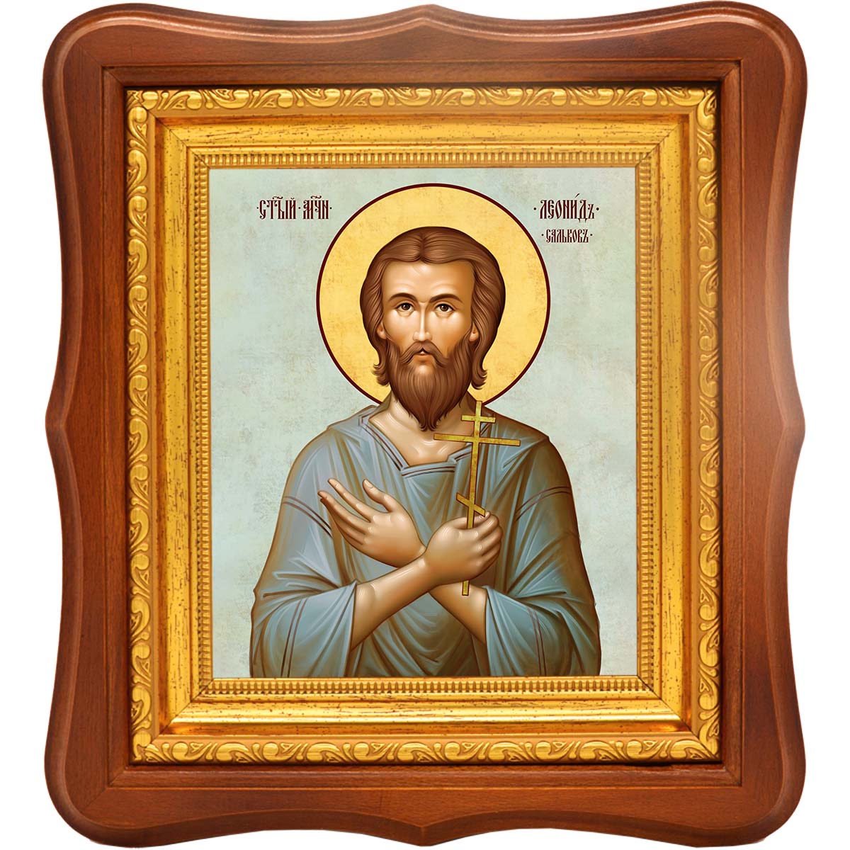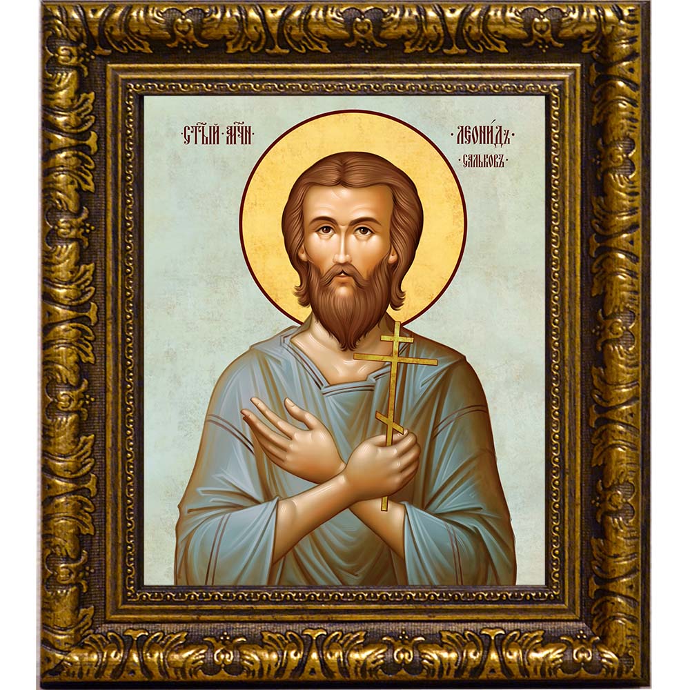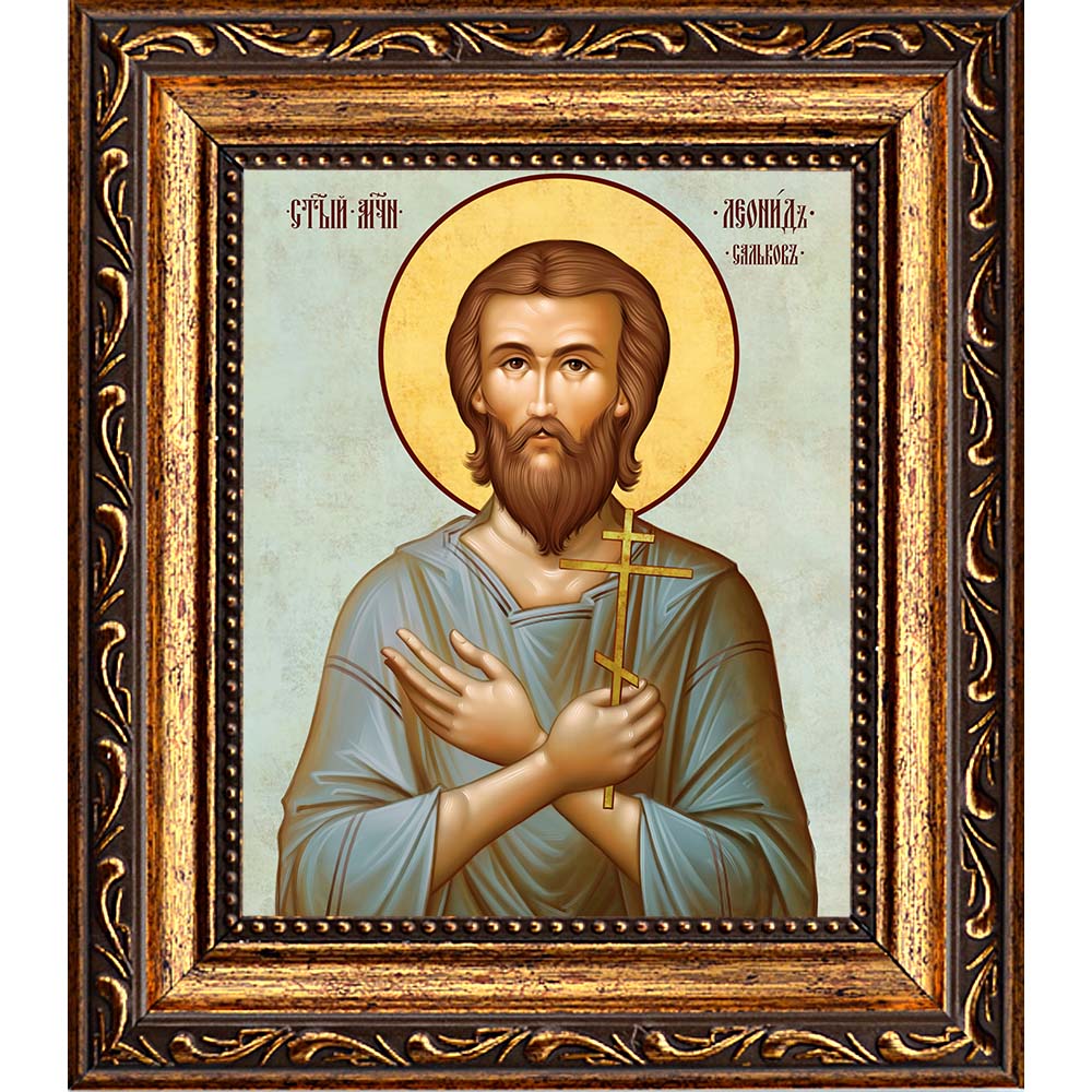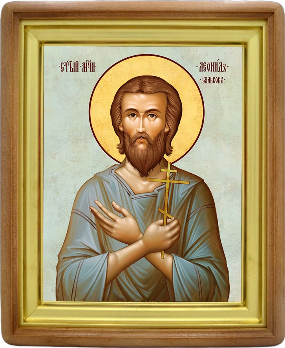 Икона мученика Леонида Салькова - именная икона мужчин по имени Леонид. Дни памяти: 2 декабря, 8 февраля (переходящая дата) - Собор новомучеников и исповедников Церкви Русской, 23 августа - Собор новомучеников и исповедников Соловецких Икона освящена.