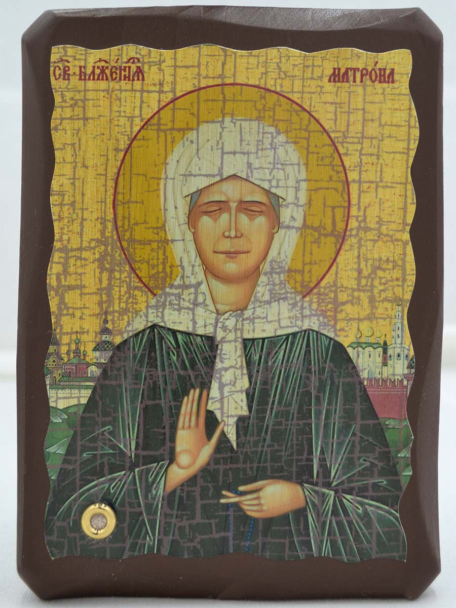 Икона святой блаженной Матроны Московской создана афонскими мастерами. Золочение поталью и надписи сделаны вручную. В икону встроен мощевик с ладаном.