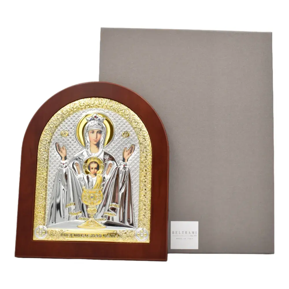 Эта икона выполнена с особым благоговением и заключена в изящный серебряный оклад, изготовленный в Италии. Серебро — символ чистоты и благодати. Такой оклад не только защищает и украшает образ, но и делает его по-настоящему драгоценной, семейной святыней, которая будет передаваться из поколения в поколение.