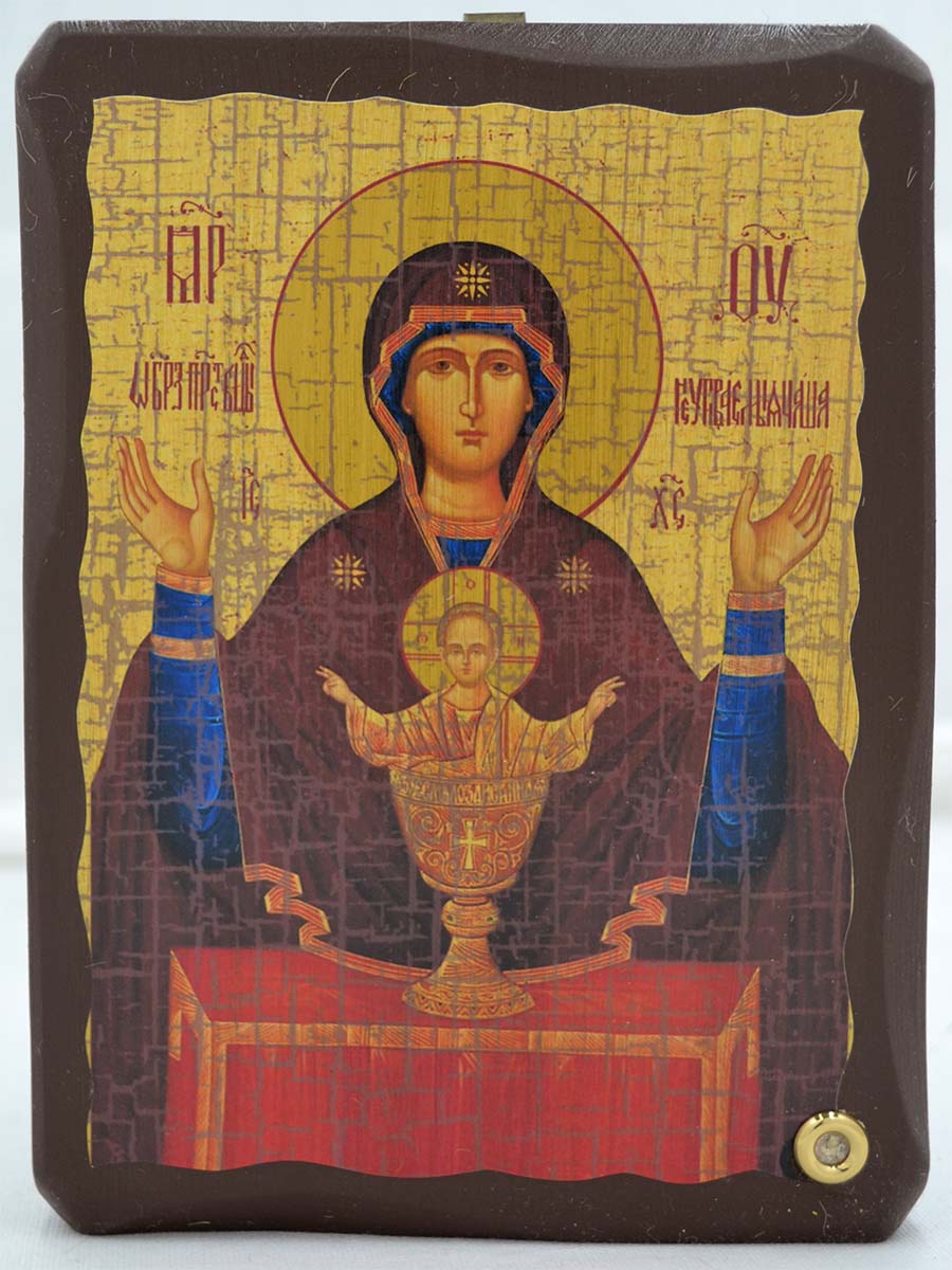 Икона Богородицы "Неупиваемая Чаша" выполнена афонскими мастерами. В икону вмонтирован мощевик с афонским ладаном, освященном на святых мощах.