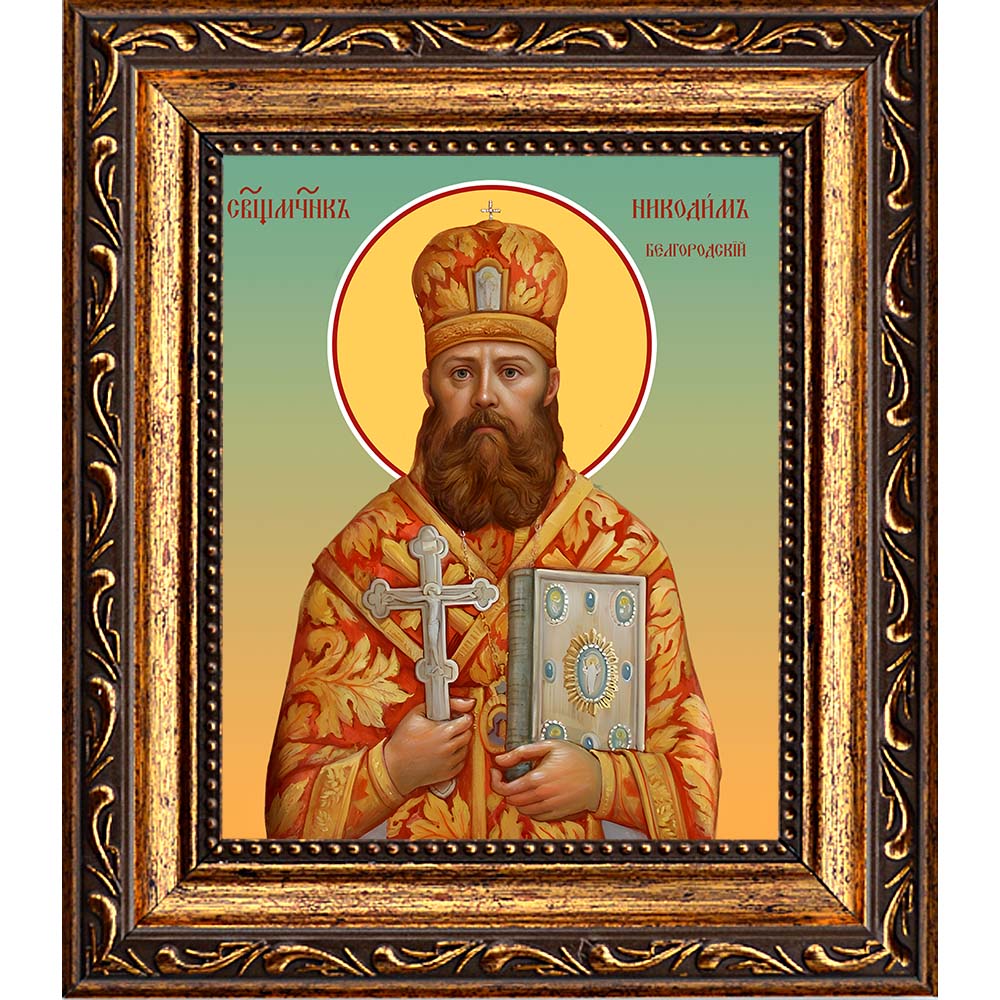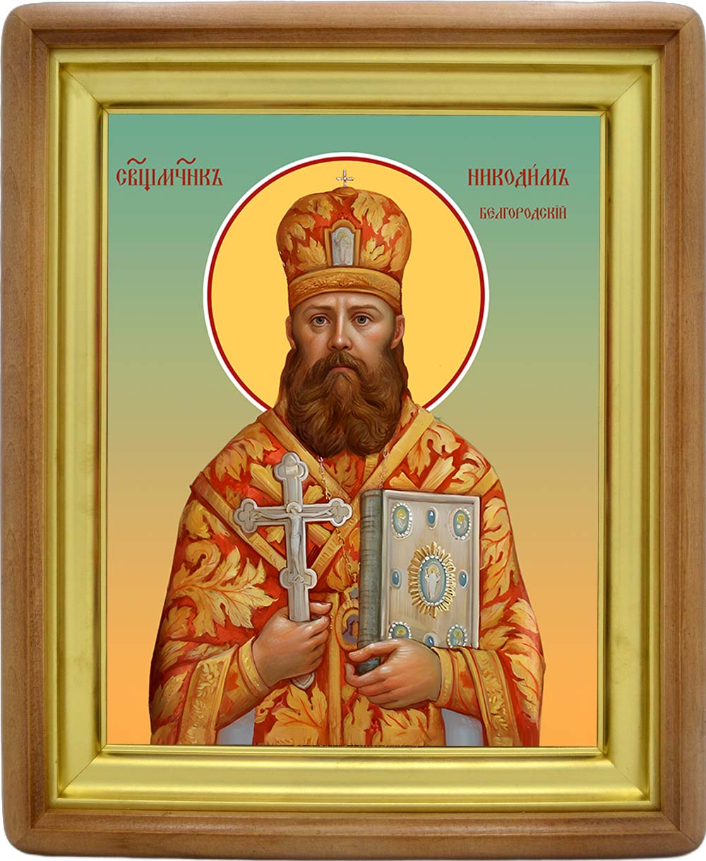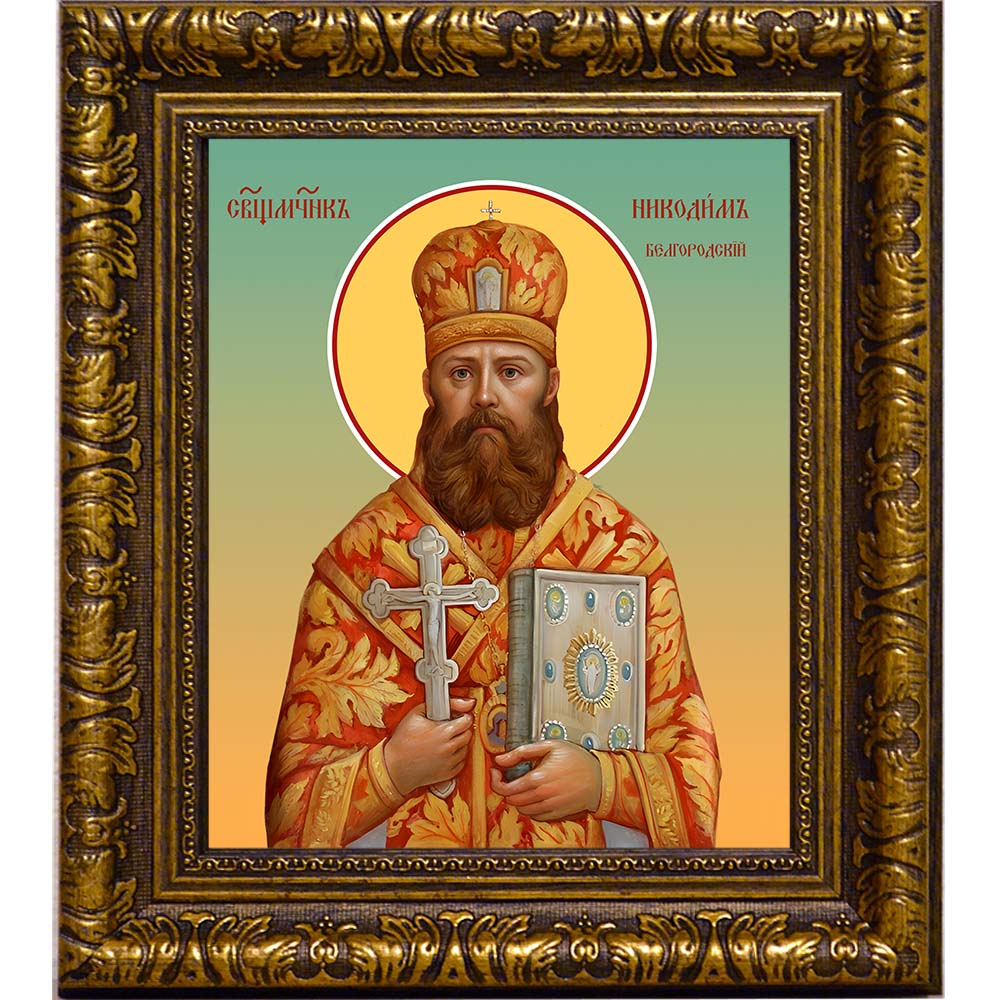 Икона священномученика Никодима Белгородского - именная икона мужчин по имени Никодим. Дни памяти: 10 января; 8 февраля (переходящая) - Собор новомучеников и исповедников Церкви Русской; 1 ноября - Собор святых Архангельской митрополии; 4 ноября - Обретение мощей. Икона освящена.