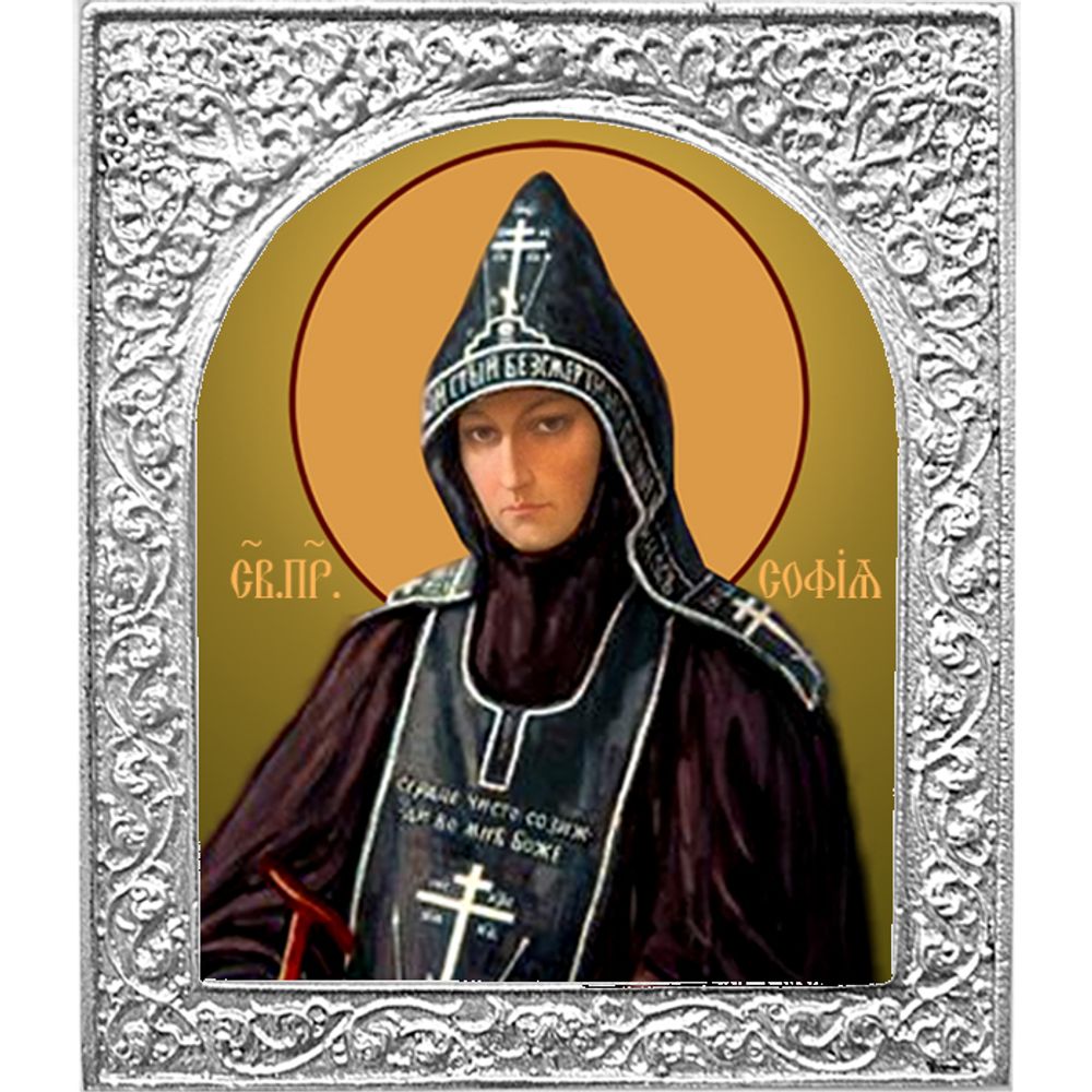 Оформленную в серебренную рамку маленькую икону праведной Софии удобно всегда носить с собой в бархатном мешочке, а также разместить дома или на рабочем месте.