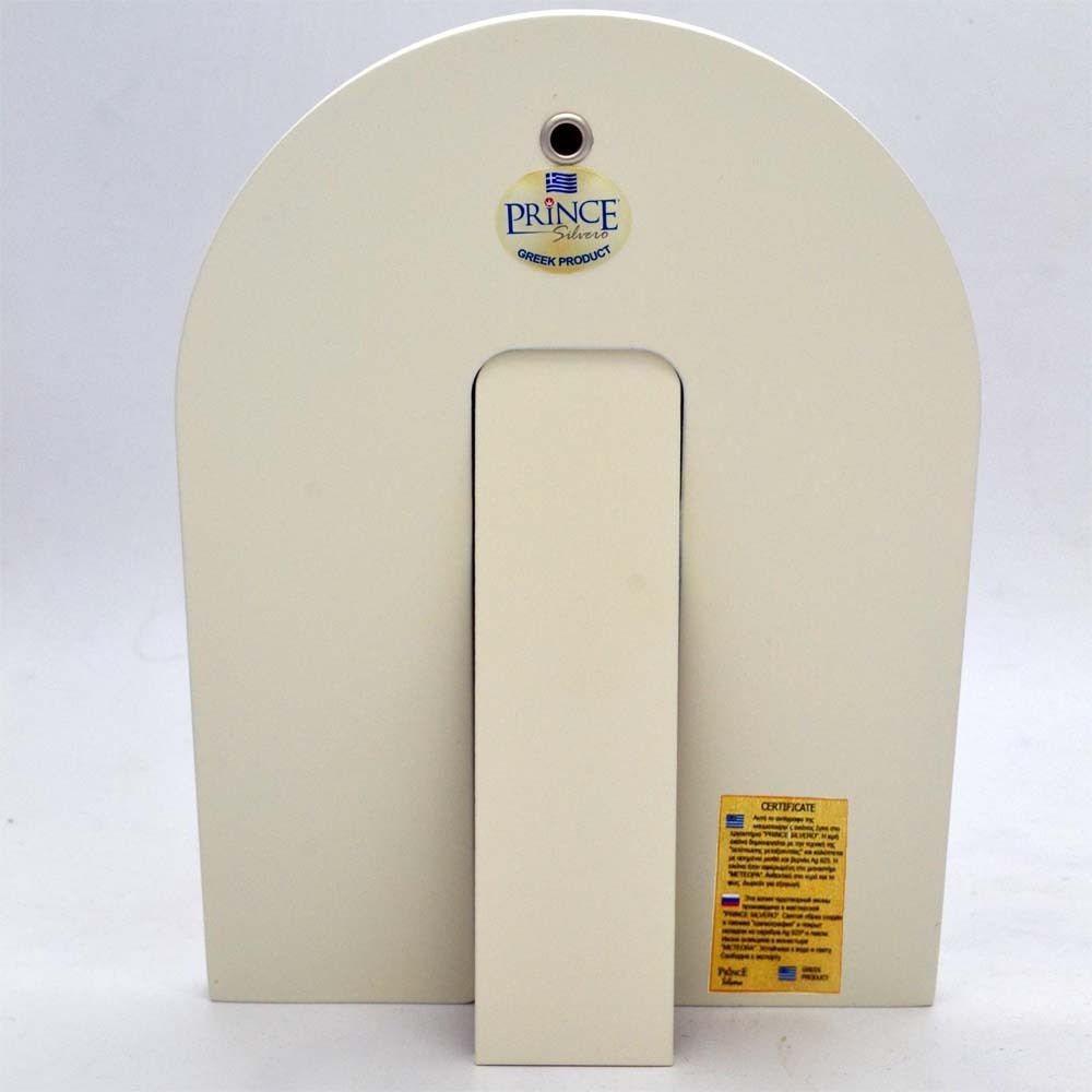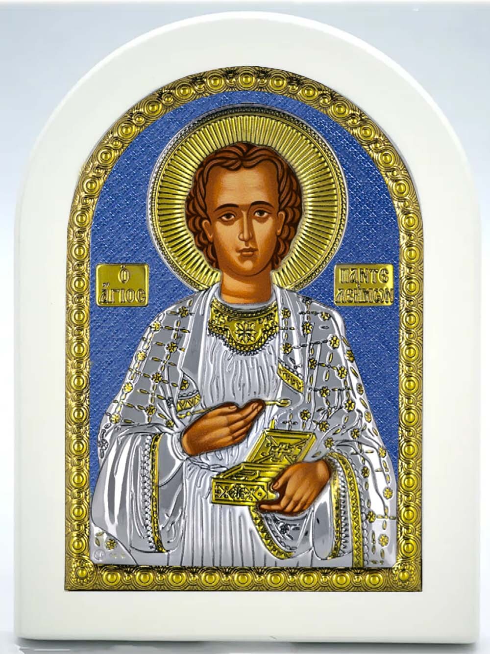 Икона Святого Пантелеймона в серебряном окладе с цветным лаком - красивый православный подарок врачу, военному или болеющему человеку.