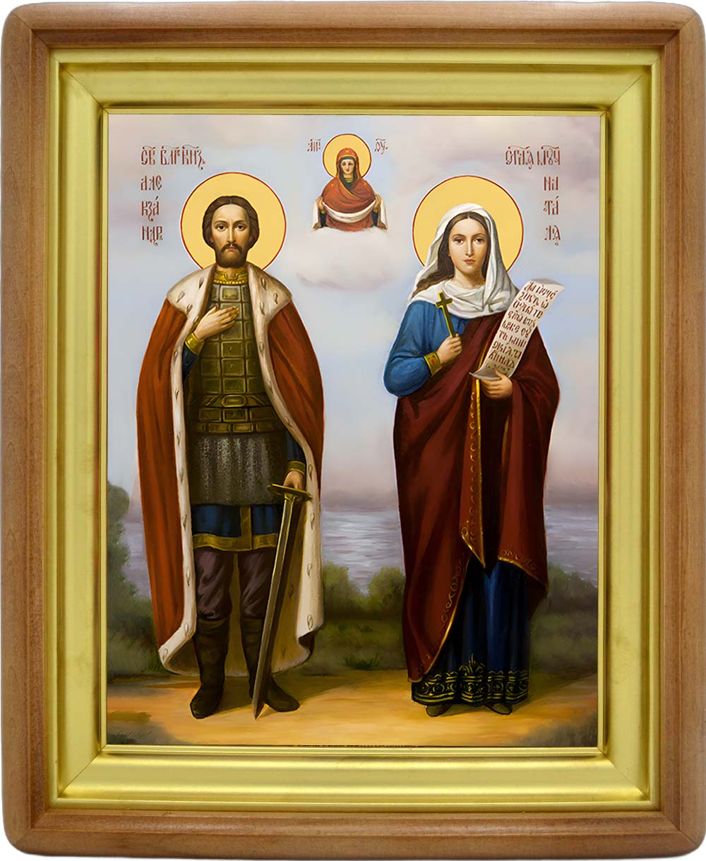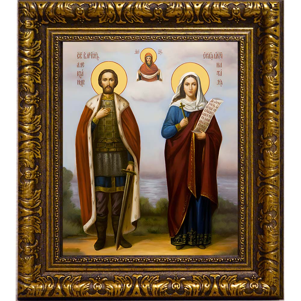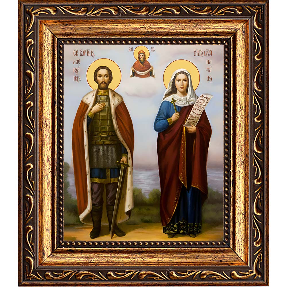 Икона «Святые благоверный князь Александр Невский и мученица Наталия Никомидийская» — особенный и очень личный подарок для супружеской пары или влюблённых, носящих имена Александр и Наталия.